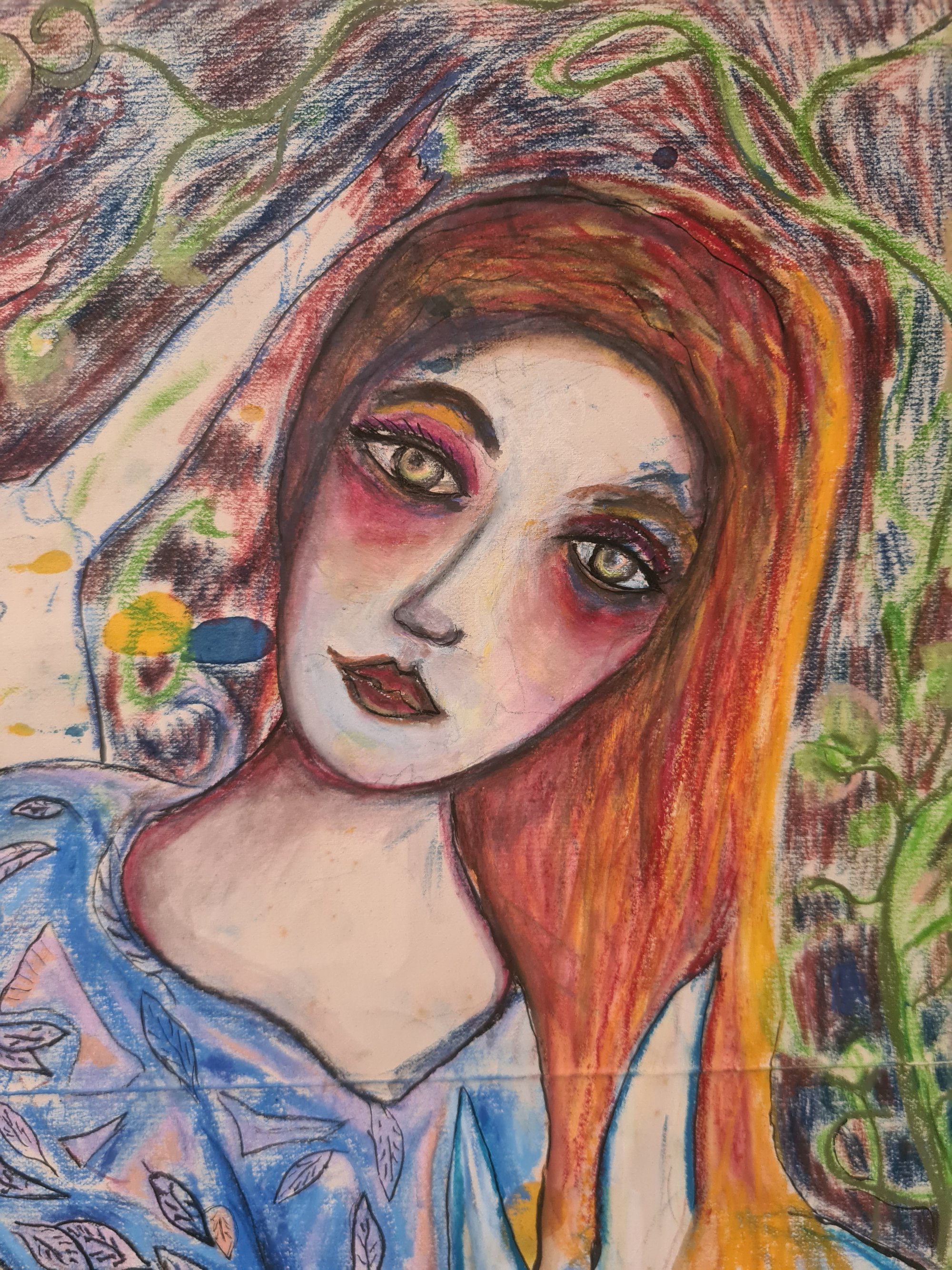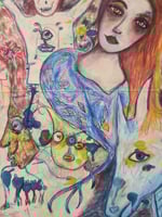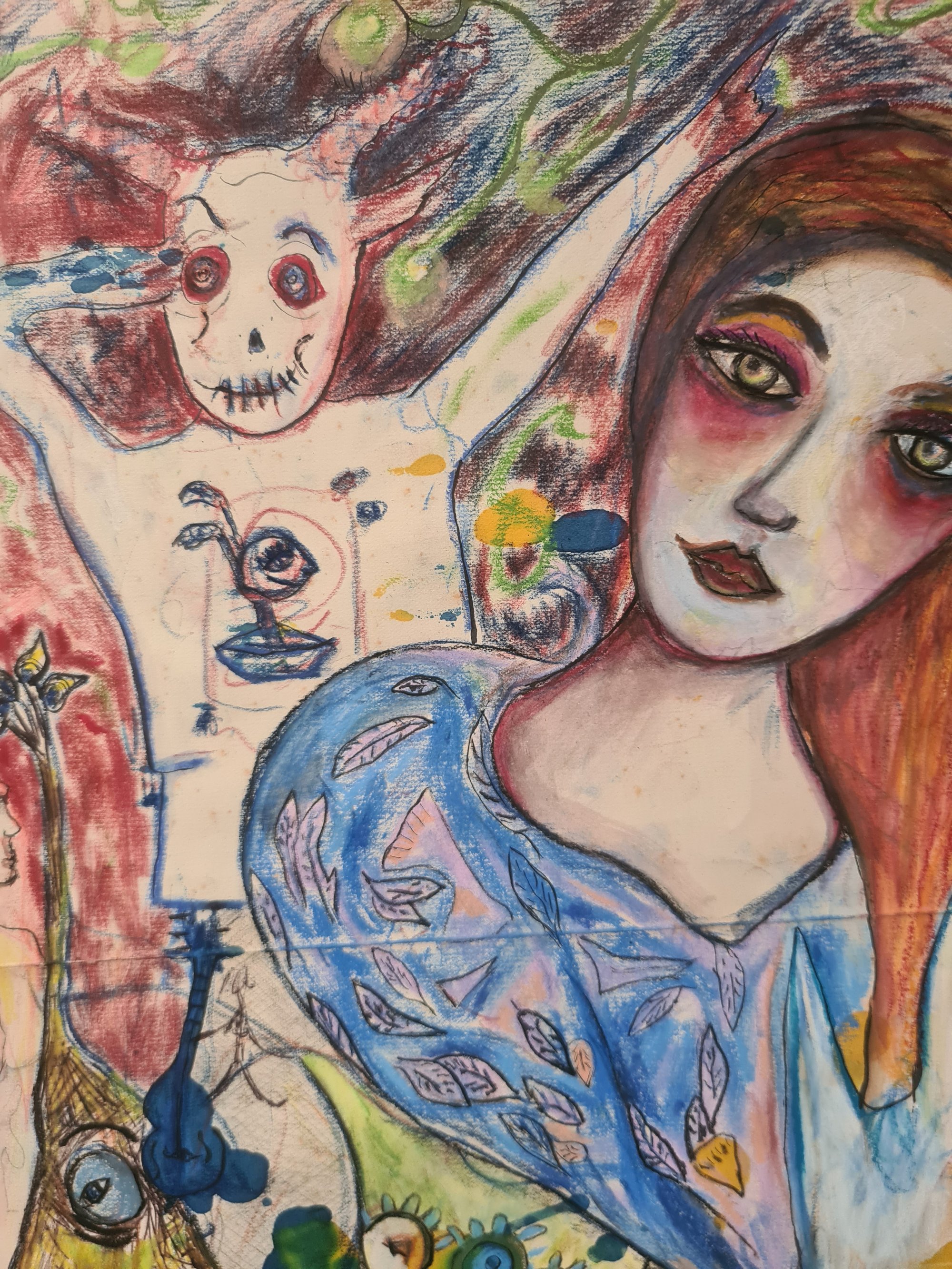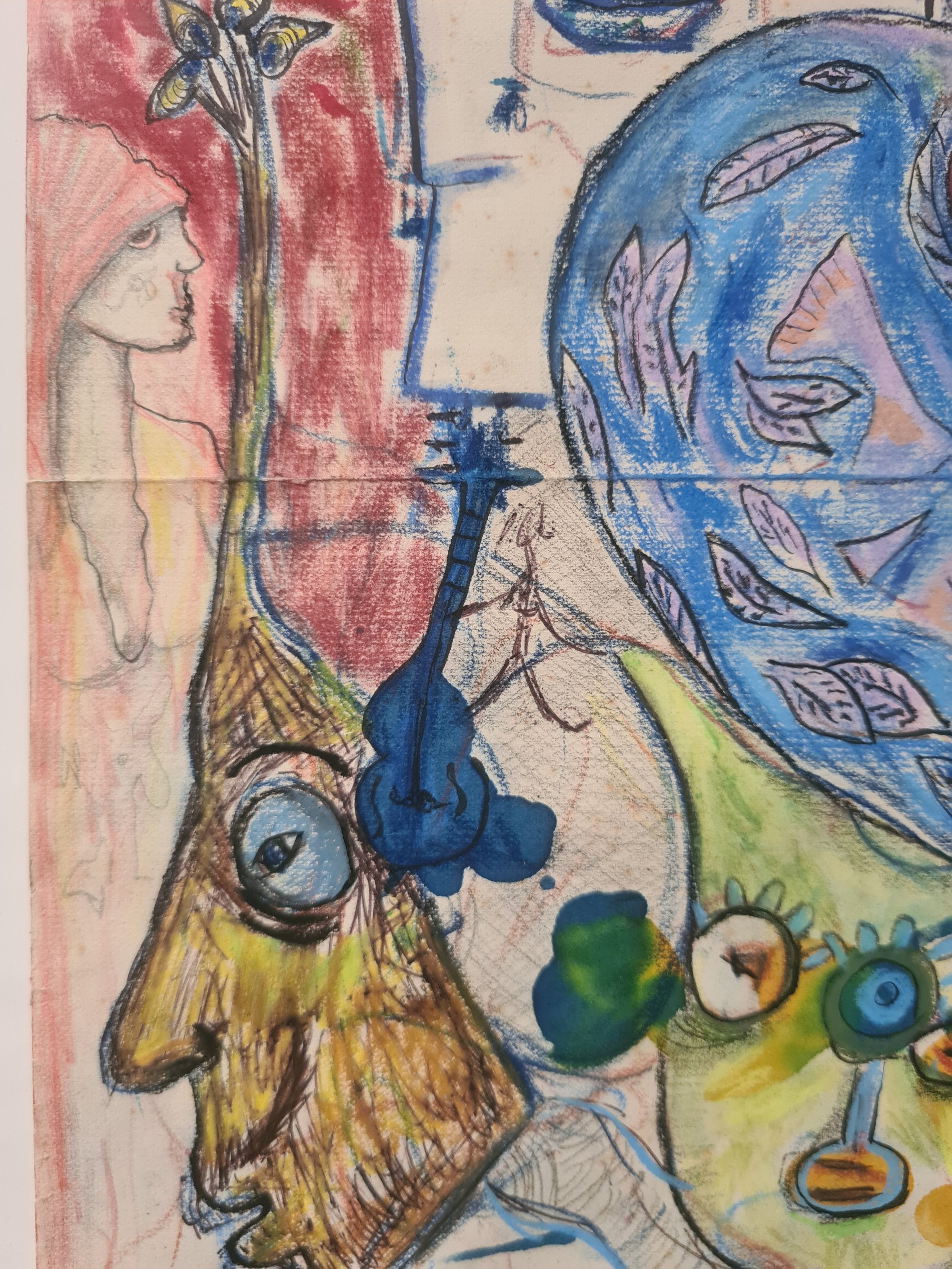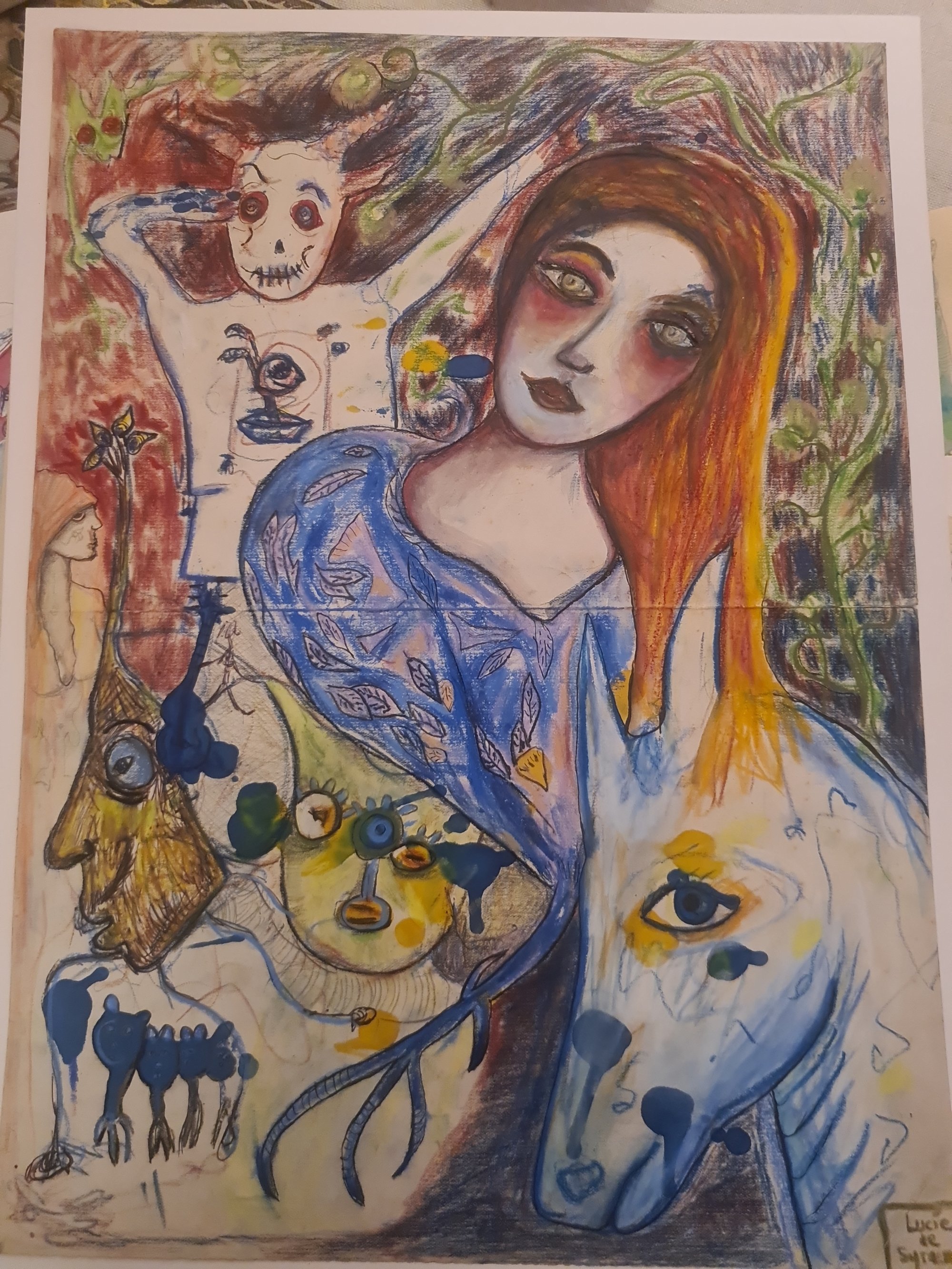 Scène onirique dense, peuplée de figures protectrices, d’esprits et d’un cheval bleu.