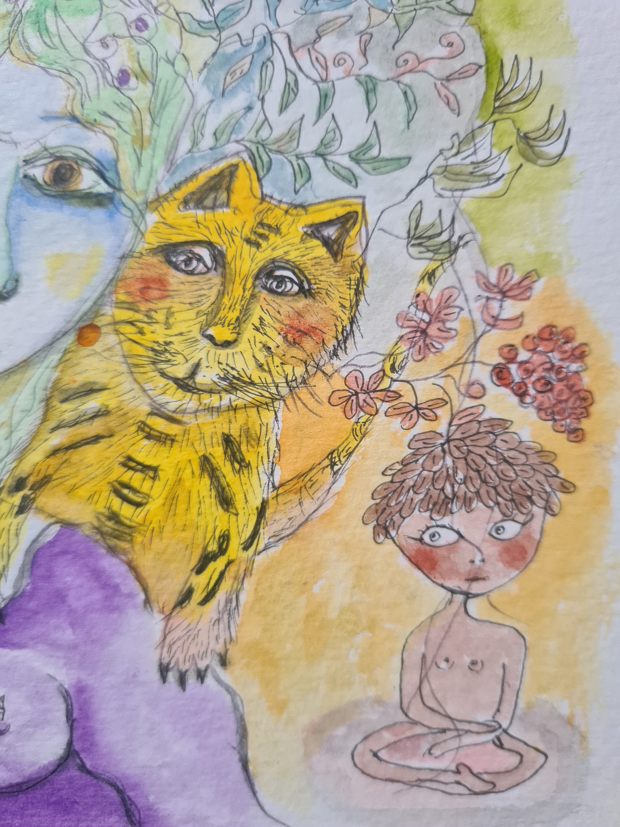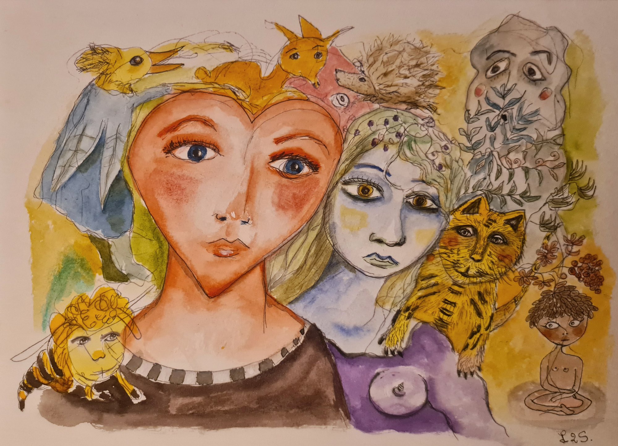Visage en forme de cœur, accompagné d’une figure bleue et d’animaux chimériques.